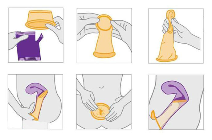 - Bước 2: Vòng dày bên trong có đầu kín được đặt vào âm đạo và giữ bao cao su cố định. Vòng ngoài mỏng, nằm bên ngoài cơ thể và che kín lỗ âm đạo