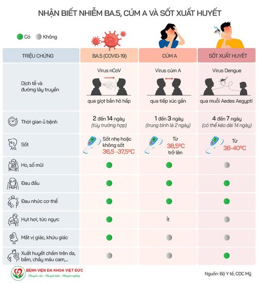Hiện nay, chúng ta đang phải đối mặt với không chỉ Cúm A mà còn rất nhiều bệnh nguy hiểm khác. Đặc biệt là biến chủng mới của Covid-19 BA.5 và Sốt xuất huyết. Vậy dựa và những dấu hiệu nào để nhận biết? Hãy theo dõi hình ảnh dưới đây.